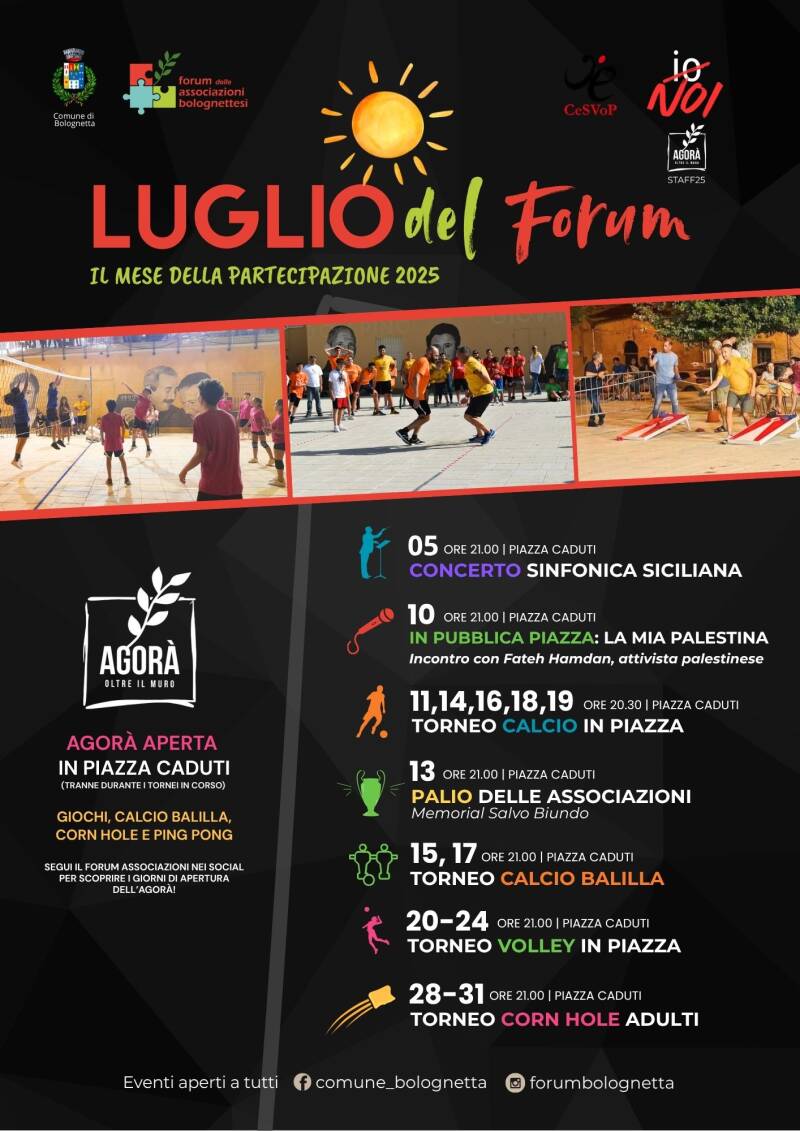 Giunge poi alla sua terza edizione anche il Palio delle Associazioni, che quest'anno sarà dedicato a Salvo Biundo, educatore scout e donatore AVIS scomparso prematuramente pochi mesi fa. Salvo Biundo è stata una figura esemplare, sempre impegnato nel sociale, pronto ad aiutare gli altri e a contribuire con competenza e dedizione al bene della comunità. Nel suo spirito, il "Luglio del Forum" si propone come un'occasione d'incontro: un momento per unire generazioni, abbattere barriere sociali e costruire ponti tra i cittadini di Bolognetta e chiunque voglia vivere questa esperienza di condivisione.